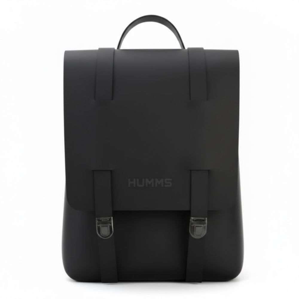 Mochila MAMMBO en Moonectar Negro, con tapa de PU Scotch y cerradura peltre. El cuerpo tiene 34 cm de altura, 28 cm de ancho y 13 cm de profundidad. (Se le puede agregar interior de cartera LIMMBO)